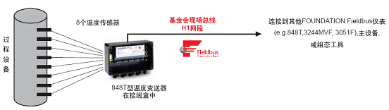 848T是基于基金會現(xiàn)場總線的8通道溫度變送器,-40oC~85oC的工作環(huán)境能力保證了它可以在現(xiàn)場安裝,并且每個848T只占用Ff總線網(wǎng)段上的一個站點;故在一個網(wǎng)段上可以連接多個848T,或與其它現(xiàn)場總線儀表、閥門混合連接;多通道溫變大量節(jié)省了常規(guī)需連接到控制室內的熱電偶補償電纜或熱電阻三芯電纜。