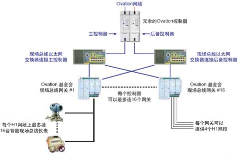 在該典型的結構中,Ovation FF現(xiàn)場總線模塊就像傳統(tǒng)I/O模塊一樣直接安裝在I/O底板上,沒有特定的地址要求,即插即用的功能方便了系統(tǒng)硬件組態(tài);每一個FF模塊可提供兩個H1網(wǎng)段,每個網(wǎng)段最多支持16臺現(xiàn)場總線設備;當前Ovation的每一對控制器最多可支持24個H1網(wǎng)段。