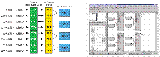 針對溫度傳感器容易損壞且長時間運行、不便維修的工藝場合,848T可應用于4個分組冗余溫度的監(jiān)測,以提高現(xiàn)場信號的可靠性: