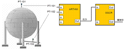運用算術功能塊完成罐底和罐頂?shù)牟顗河嬎?再通過線性化功能塊以20點的采樣值來擬合出相應的差壓和體積的線性關系,并可以在罐底3051S的表頭上直接顯示罐的體積。