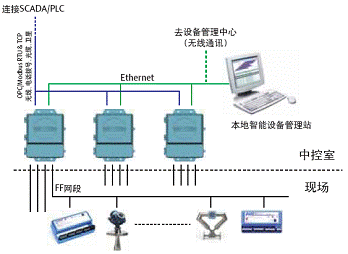 有時用戶會遇到如何在傳統(tǒng)的控制系統(tǒng)中加入FF功能的要求,比如傳統(tǒng)DCS改造項目中增加智能設備、上新項目但主系統(tǒng)是不支持FF總線的PLC控制器時;艾默生公司研發(fā)了一款現(xiàn)場總線接口模塊-3420 FIM,該模塊可提供4個H1網(wǎng)段,最多連接64個FF智能設備,它將現(xiàn)場的過程信號和控制指令轉換成標準的ModbusRTU或OPC通訊協(xié)議,與傳統(tǒng)控制系統(tǒng)或上位機直接通訊,并通過以太網(wǎng)連接AMS設備管理系統(tǒng)對FF智能設備進行管理和診斷,讓用戶獲得FF技術帶來的優(yōu)勢和利益。