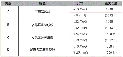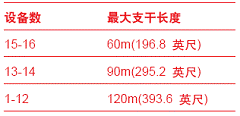 若使用屏蔽雙絞線,現(xiàn)場總線電纜的長度不能超過1900m(6332英尺)。其中電纜的長度為主干長度加上所有支干長度,在終端器之間的區(qū)域部分定義為主干,所有離開主干的部分稱為分支,主干的兩端均設有終端負載。如果可以選擇支干的長度,則越短越好。支線的總長受支干數(shù)目與每條支干上設備的數(shù)量限制,如下表所示。