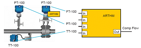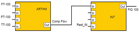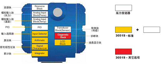 3051S在提供常規(guī)的功能塊(白色框所示)的同時,還具備了輸入選擇、算法、信號線性化、累計、顯示等標準功能塊配置,所有這些功能塊與DeltaV/Ovation系統(tǒng)中的功能塊是沒有任何差異的。其算術功能塊可方便地將來自溫度、壓力變送器的信號在3051S差壓變送器中計算出溫壓補償后的瞬時流量, 這樣操作人員可以在現(xiàn)場看到準確的、經(jīng)過補償?shù)牧髁恐?而無需回到操作室看控制系統(tǒng)畫面。