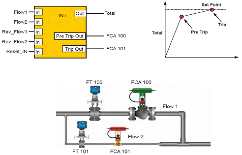 FT100和FT101分別測量大管道流量Flow1和小管道流量Flow2,其中在FT100是3051S FF差壓變送器;利用FT100的累計功能塊來計量Flow1和Flow2的總體累積量,當達到示意曲線中預設值Pre Trip點時,累積功能塊Pre Trip Out輸出開關信號關閉FCA100閥門,只用Flow2來作流量細調;當FT100中累積到設定點(Set Point)時再由功能塊Trip Out輸出開關信號,關閉FCA 101閥門;最后實現(xiàn)分程精密灌裝的功能。