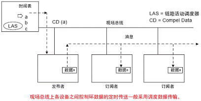 包含一張用于引發(fā)循環(huán)基的行動表。在計劃好的時刻來臨時,LAS準時向現(xiàn)場總線設備中的某一特定數(shù)據(jù)緩存發(fā)出一個強制數(shù)據(jù)(CD)。該設備立即向現(xiàn)場總線上的所有設備廣播或 "發(fā)布" 一個消息。這在 LAS 的作業(yè)中具有最高優(yōu)先級。剩余的作業(yè)將在調度傳送之間完成。