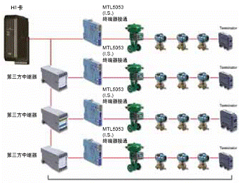 H1現(xiàn)場總線還可支持現(xiàn)場本安設備的應用。在安全區(qū)內的電源與危險區(qū)內的本安設備之間安置本安安全柵。(見圖)