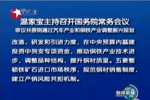 中廣網(wǎng)北京1月14日消息 國務(wù)院總理溫家寶14號(hào)主持召開國務(wù)院常務(wù)會(huì)議,審議并原則通過汽車產(chǎn)業(yè)和鋼鐵產(chǎn)業(yè)調(diào)整振興規(guī)劃。