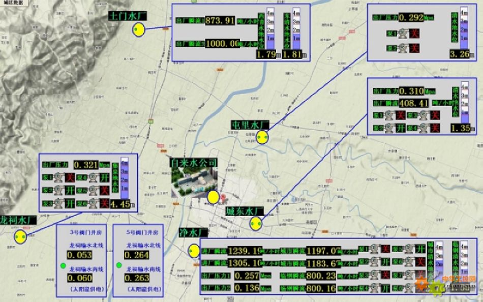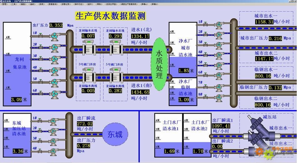 通過這套系統(tǒng)可以清楚地看到市區(qū)各分水廠的管網(wǎng)壓力、清水池水位、瞬時出水量、水泵的開停狀態(tài)等,通過這些數(shù)據(jù)就可以判別出每個分廠自來水供應的情況,出現(xiàn)問題能準確定位,杜絕不必要的停水區(qū)域和范圍,全力保證全市人民安全用水。