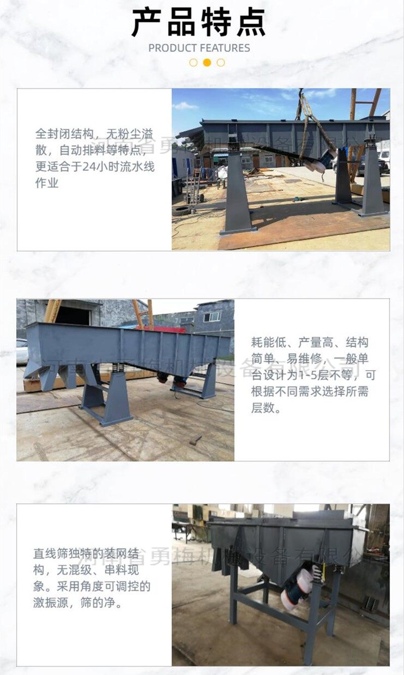 直線篩分機具有耗能低、產(chǎn)量高、結(jié)構(gòu)簡單、易維修、全封閉結(jié)構(gòu),無粉塵溢散,自動排料,更適合于流水線作業(yè)。勇梅機械直線篩通常適用于 0.074-5mm 的物料粒度篩分。直線篩分機主要由篩箱、篩框、篩網(wǎng)、振動電機、電機臺座、減振彈簧、支架等組成。其中,篩箱是主要組成部分,由不同厚度鋼板焊制而成;篩框一般由松木或變形量較小的木材制成,用于保持篩網(wǎng)平整;篩網(wǎng)有低碳鋼、黃銅、青銅、不銹鋼絲等多種材質(zhì);振動電機為設(shè)備提供動力;減振彈簧則用于阻止振動傳給地面,并支持篩箱重量。
